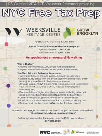Weeksville is proud to partner with Grow Brooklyn to offer free Tax Preparation Services! Join us Saturday, April 4th from 11am to 4pm  or Thursday April 9th from 6-8pm to prepare your taxes with Grow Brooklyn’s IRS Certified VITA/TCE Preparers.